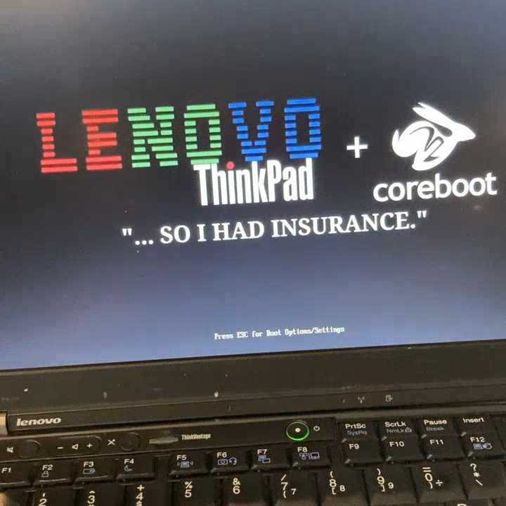 Now any other idiot that got up to here would leave it there, but not I. The SeaBIOS payload in the coreboot only supported legacy BIOS, and no UEFI. I want my UEFI. Actually I was gonna leave it there but my friend insisted on it and I figured why not. We also decided it should have a custom splash anyways, and I found another guide that covered this exact thing. We went through several iterations of a splash image featuring Rikka and inside jokes but ultimately I decided on a simpler one. I compiled the new BIOS with the splash and he flashed it from inside the OS this time, and it worked fine. But he had to reinstall the OS because the new BIOS only supported UEFI this time, more fun to him!