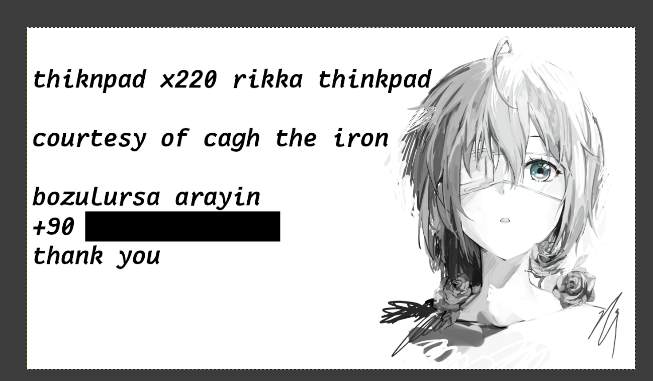 After all this, the laptop was finally back alive. I asked him how much RAM the OS reported, and as if the cruel fate was laughing its ass off, it reported 8GB RAM. He replaced one of the sticks with a 4GB one he had and wouldn't you know it, it said 12GB. All of this trouble was because of me misinterpreting a broken RAM. To be fair, my thought process was that I bought the RAM new and so it must've been working fine, and I would still try to flash coreboot later on and probably mess it up. At least that's the silver lining. As he was the one who resurrected this laptop, I asked him to give it a name. He immediately decided on Rikka. Rikka is now my first device that does not have a name from Girls' Frontline, Kantai Collection or Azur Lane.